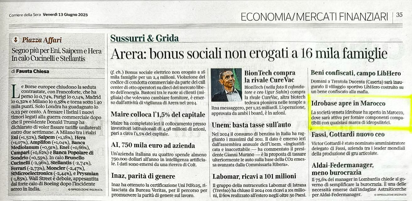 È stata infatti annunciata la nascita di Idrobase Marocco per la fornitura di componenti compatibili con qualsiasi grande marca di idropulitrici, confermando la “leadership” del “made in Italy” nel settore; ciò, mentre prosegue l’iter per l’avvio delle prime produzioni su licenza in Algeria.